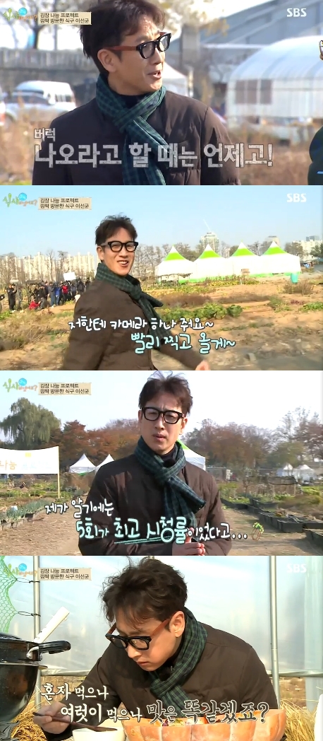 7일 오전 방송된 SBS '잘 먹고 잘 사는법 '식사하셨어요'는 김장 특집으로 배우 김혜수, 유선, 송윤아, 김민정, 한고은, 방송인 샘 헤밍턴등 이전까지 출연했던 게스트들이 함께 했다. 이선균은 이들이 오프닝을 모두 마친 후 김치와 무를 뽑을 때에 도착, 지각생으로 등장했다.