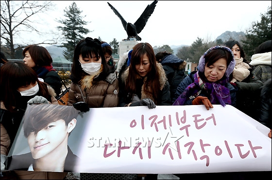 가수 세븐이 21개월간의 군복무를 마친 뒤 28일 오전 경기도 포천 영북면 8시단 7598부대에서 제대하는 가운데 이날 팬들이 세븐을 기다리며 응원하고 있다.
