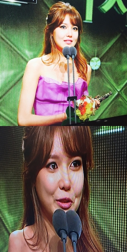 걸그룹 소녀시대 멤버 태연과 써니가 2014 MBC 연기대상에서 우수 연기상을 수상한 수영에게 축하의 인사를 전했다.
