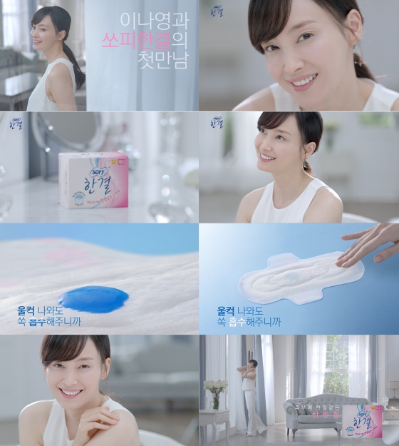 이번 광고는 '이나영과 쏘피 한결의 첫 만남'이라는 콘셉트로, '쏘피 한결'에 대한 자신의 솔직한 사용 후기를 전하고 있다. 광고 속에서 이나영은 자연스러운 옷차림과 편안한 모습으로 '한결'의 산뜻함을 연출했다.