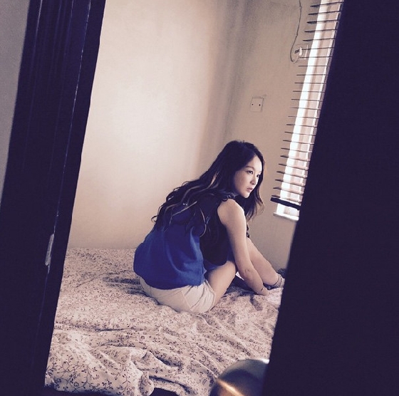 공개된 사진 속 강민경은 침대에 앉은 채 우수에 젖은 눈빛으로 창밖을 물끄러미 바라보고 있다.