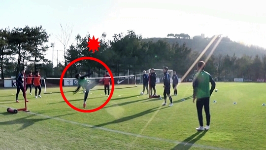 특히 분위기 메이커는 '손날두' 손흥민이었다. 손흥민은 족구 경기 내내 고래고래 소리를 지르며 분위기를 띄웠다. 팀이 수세에 몰리자 승부욕도 발동했다. 급기야 몇 차례 몸을 푼 뒤 환상 시저스킥을 날렸다. 족구에 몰입하고 있던 취재진 사이에서는 탄성이 터져 나왔다.