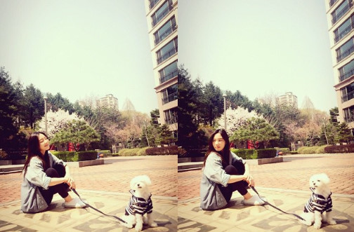 걸그룹 소녀시대의 태연이 애완견과 함께 봄 햇살 아래 산책을 즐겼다.