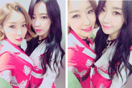 공개된 사진 속 가은은 같은 팀 멤버 수빈과 무대의상을 갖춰 입고 몸을 밀착시킨 채 다정함을 과시하며 카메라를 응시하고 있다.