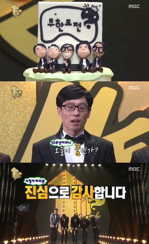 이날 유재석은 "오늘 드디어 무한도전 10주년을 맞이했습니다"며 "시청자 여러분 진짜 감사합니다"고 말했다.