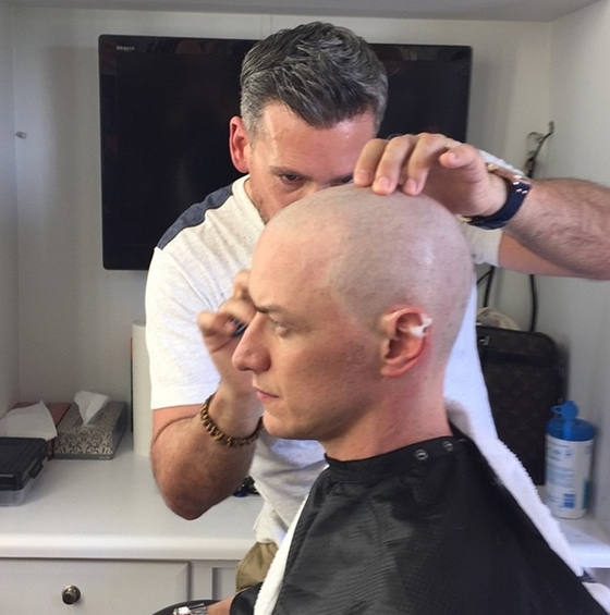 '엑스맨:아포칼립스' 촬영을 앞둔 제임스 맥어보이가 영화 속 대머리로 등장하는 '프로페서X' 찰스 자비에 박사 캐릭터를 위해 머리를 삭발하고 있는 장면으로 보인다. 삭발에도 굴욕 없는 제임스 맥어보이의 두상이 눈길을 끈다.