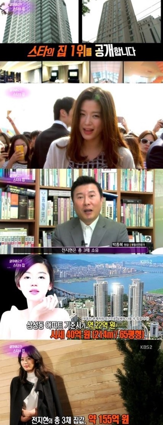 이날 전지현은 삼성동, 대치동 등 총 3채의 집을 보유하고 있으며, 이를 합산하면 총 155억에 육박하는 것으로 알려졌다.