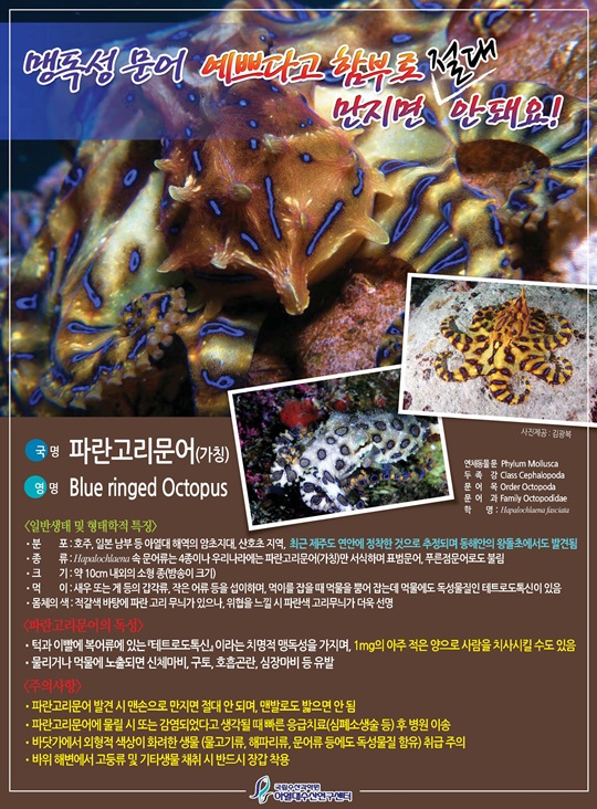 국립수산과학원은 파란고리문어류의 위험성을 알리기 위해 작년에 이어 취급주의 포스터를 제주도내 해수욕장, 수협 등 관련기관에 배포할 예정이다.