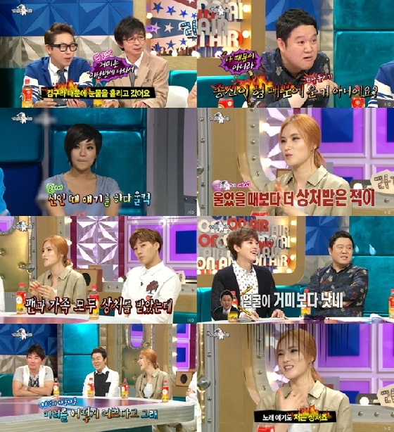이날 MC들은 거미에게 "거미는 지난 번에 나와서 김구라 때문에 눈물을 흘리고 갔다"고 말했다.