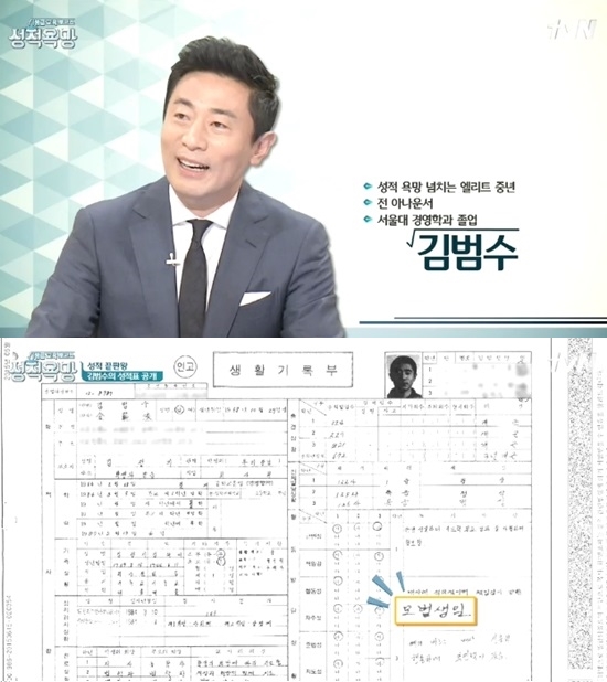 김범수는 25일 오후 방송된 케이블채널 tvN 예능프로그램 '성적욕망'에서 생활기록부가 공개됐다.