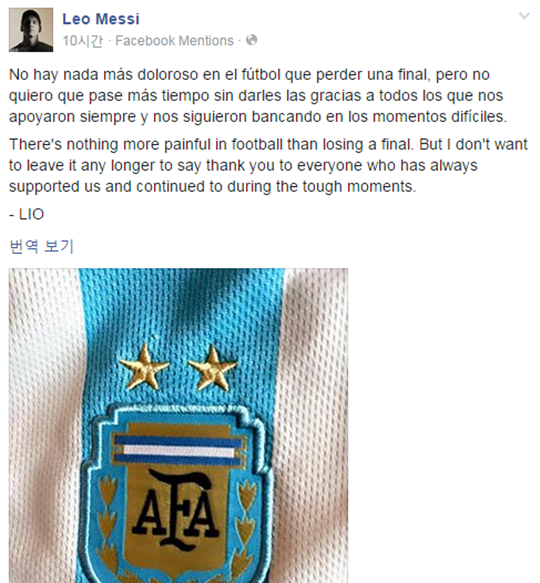 메시는 7일(이하 한국시간) 자신의 페이스북에 "결승전에서 패하는 것만큼 고통스러운 일은 없다. 하지만 더 이상 우리를 지지해준 팬들에게 감사의 인사 하지 않을 수 없다. 시간을 소비하고 싶지 않다"고 전했다.