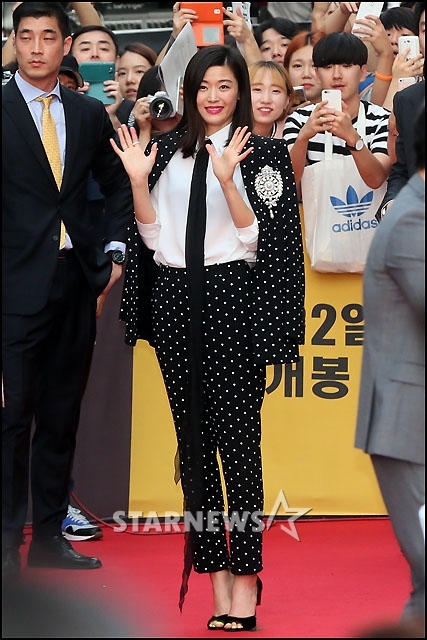 배우 전지현이 7일 오후 서울시 중구 청계광장에서 열린 영화 '암살'(감독 최동훈·제작 케이퍼필름) 쇼케이스에 참석해 팬들에게 인사를 하고 있다.