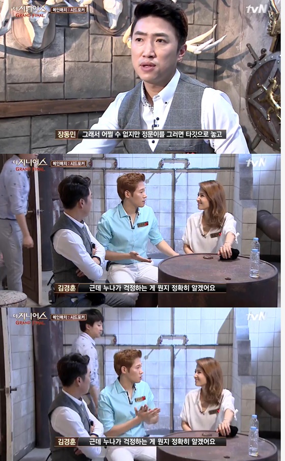 장동민은 김경란에게 "누나가 도와줄 건지 안 도와 줄건지 얘기하라"며 "누나가 우승하고 홍진호에게 생명의 징표를 주고 나머지는 꼴등 안하고 최정문만 꼴등하면 된다"고 덧붙였다.