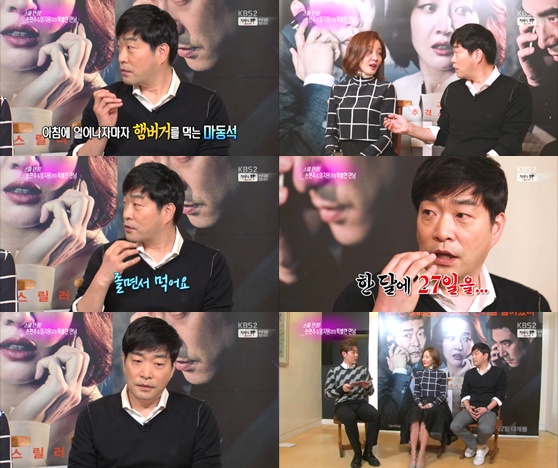 손현주는 마동석과의 친분을 밝힌 뒤 마동석의 아침식사 습관에 대해 말했다. 그는 "마동석 씨는 아침에 일어나자마자 햄버거를 먹는다. 졸면서 먹는다"라고 말했다.