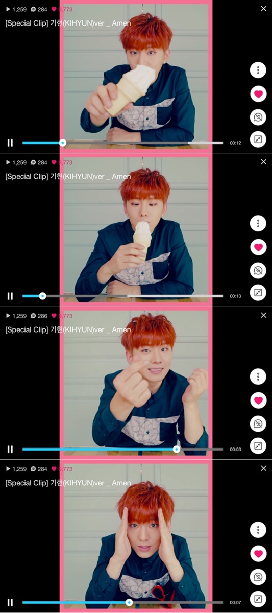이어 기현은 마치 팬들에게 아이스크림을 먹여주듯 카메라에 아이스크림을 갖다대기도 하고, 하트 모양의 선글라스를 끼기도 하며, 손하트를 선사하는 등 다양한 '심쿵' 매력을 선보여 눈길을 끌었다.