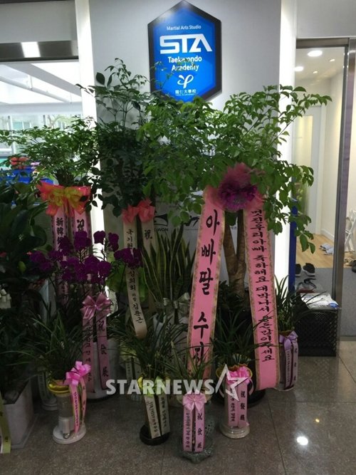 태권도장 현관 앞에 여러 축하 화분이 놓여있는 가운데 단연 딸 수지가 보낸 화분이 눈길을 사로잡는다.