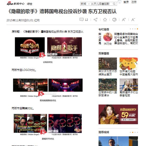중국 온라인매체 시나닷컴은 지난 3일 동방위성TV '隐藏的歌手'(음장적가수)가 한국의 '히든싱어'를 표절했다는 내용의 보도를 했다. 또 JTBC에서 이를 문제삼았지만 해당 방송사는 표절을 부인했다고 했다.