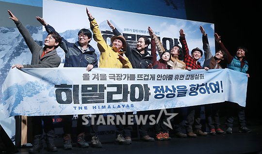 조성하, 이석훈 감독, 황정민, 정우, 라미란, 김인권, 김원해, 이해영, 전배수(왼쪽부터)가 9일 오전 서울 강남구 압구정 CGV에서 열린 영화 '히말라야' 제작보고회에 참석해 포즈를 취하고 있다.