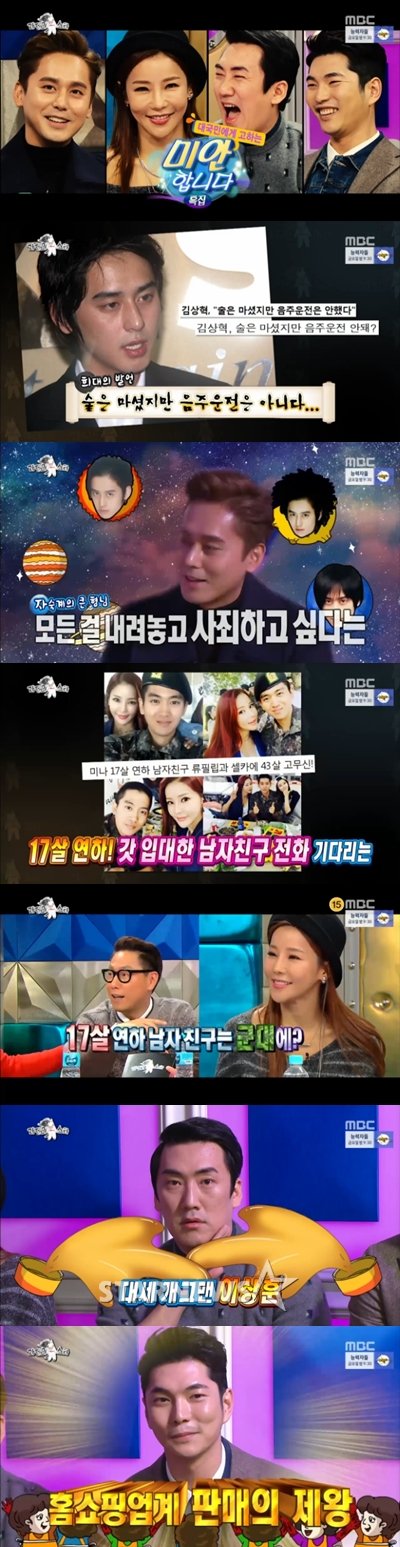 음주운전사건으로 사회적 물의를 일으킨 클릭비의 김상혁부터 17세 연하남과 연애중 인 가수 미나에 이르기까지 지난날의 잘못을 뉘우치는 연예인들이 '라디오 스타'를 방문해 본격 대국민사과방송을 펼쳤다.