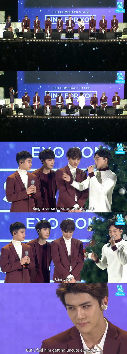 엑소는 10일 오후 10시 서울 잠실 롯데월드에서 겨울 스페셜 앨범 '싱 포 유(Sing For You)' 발매를 기념해 'EXO COMEBACK STAGE Sing For You'를 개최하고 팬들을 만났다. 이날 쇼케이스는 네이버 V앱을 통해 전세계에 생중계 됐다.