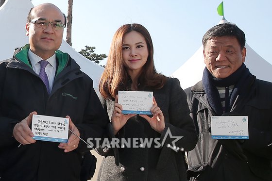 정연만 환경부 차관, 가수 아이비, 이강오 서울어린이대공원장(왼쪽부터)이 16일 오후 서울 광진구 서울어린이대공원에서 열린 디톡水 캠페인 숲 조성 행사에서 소망 메시지를 보이고 있다.