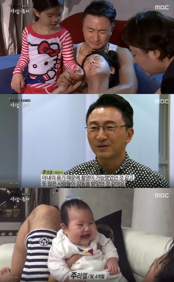 작곡가 주영훈이 아내 이윤미의 출산 장면을 방송한 것에 대해 "아내의 용기 때문에 가능했다"고 밝혔다.