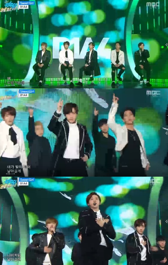 이날 B1A4는 '스윗 걸(Sweet Girl)'의 어쿠스틱 버전으로 무대에 올랐다. 검은색과 흰색으로 의상을 맞춰 입고 등장한 B1A4는 로맨틱한 분위기가 돋보이는 무대를 선보였다.