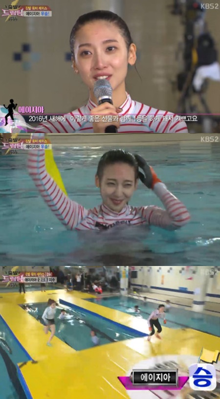 에이지아는 3일 오전 방송된 KBS 2TV 예능 프로그램 '출발 드림팀 시즌2'(이하 '출발 드림팀')에서 지수와 빙글빙글 워터 깃발 레이스 결승전을 벌여 최종 우승을 거머쥐었다.
