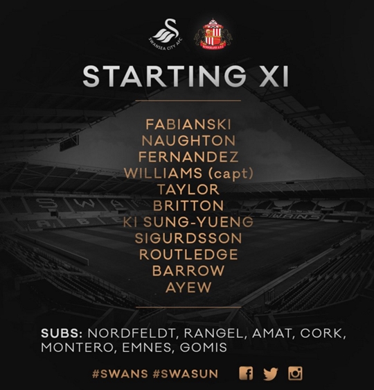 기성용은 선발 명단에 이름을 올렸다. 스완지시티는 아예우를 비롯해 바로우 라우틀리지, 시구르드손, 브리튼, 테일러, 윌리암스(주장), 페르난데스, 노튼, 파이안스키 골키퍼가 선발 출전한다.