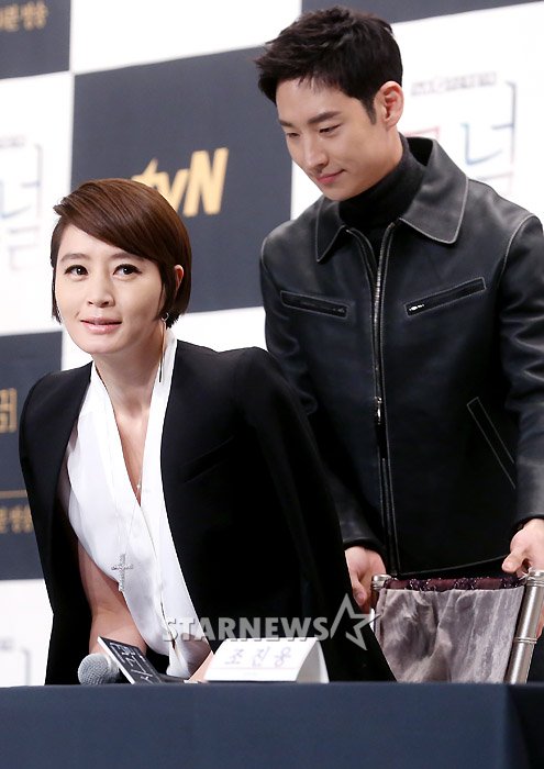 탤런트 김혜수가 14일 오후 서울 영등포 타임스퀘어에서 열린 드라마 '시그널' 제작발표회에 동료 이제훈의 에스코트를 받으며 자리에 앉고 있다.