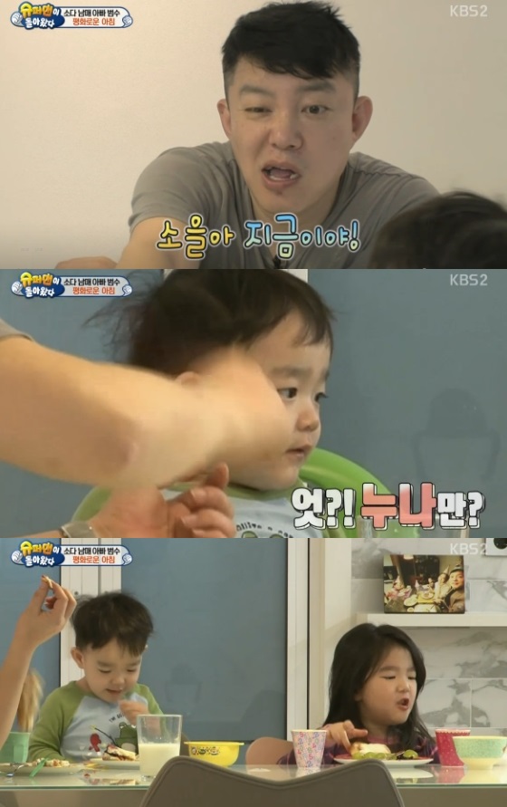 배우 이범수가 아들 다을이에게 밥을 먹이기 위해 딸 소을이와 합심했다.