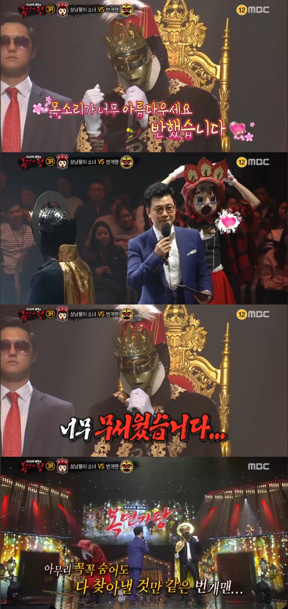 이날 3라운드에선 '성냥팔이 소녀'와 '번개맨'의 대결이 그려졌다. '성냥팔이 소녀'는 정인의 '사랑은'을 선곡해 매력적인 음색을 선보였고 '번개맨'은 임재범의 '고해'를 선곡해 원곡과는 다른 맑은 목소리와 개성있는 창법으로 새로운 매력을 발산했다.