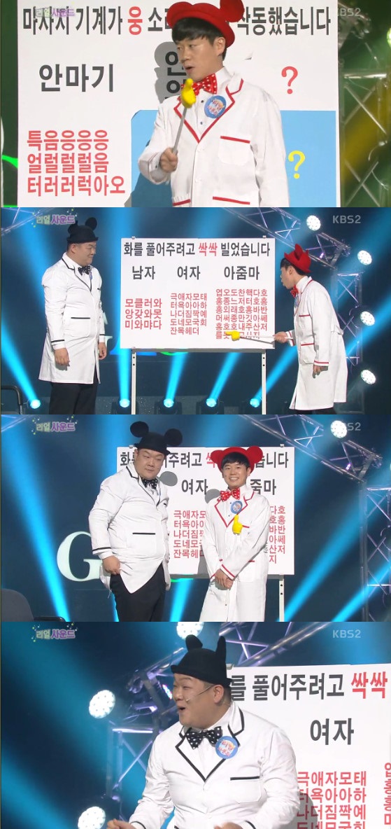 13일 오후 방송된 KBS 2TV 예능 프로그램 '개그콘서트-리얼사운드'에서는 안마기의 소리를 따라하고, 남자, 여자, 아줌마가 화난 상대에게 용서를 구하며 비는 소리를 따라하는 유민상의 모습이 그려졌다.
