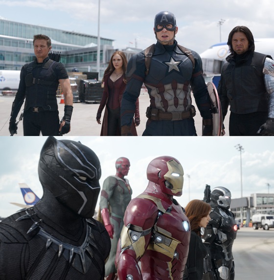 이미 알려진 대로 아이언 맨을 지지하는 히어로는 블랙 위도우(스칼렛 요한슨) 비전(폴 베타니), 블랙 팬서(채드윅 보스만), 워 머신(돈 치들)이 합류했고, 반대파에는 캡틴 아메리카, 윈터 솔져를 비롯해 팔콘(안소니 마키), 호크아이(제레미 레너), 스칼렛 위치(엘리자베스 올슨), 앤트맨(폴 러드)이 합류했다.