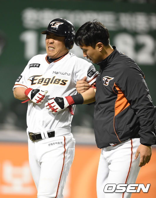 한화 정근우가 몸에 공을 맞아 교체됐으나 다행히 큰 부상을 당하진 않았다.