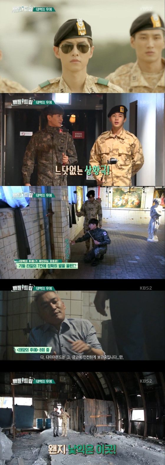 헨리와 이특은 군복을 입고 '태양의 후예'의 등장인물을 따라했다. 특히 헨리는 군복을 입은 후 "유시진입니다"고 밝혀 웃음을 자아냈다. 송중기는 '태양의 후예'에서 주인공 유시진 역을 맡았다.
