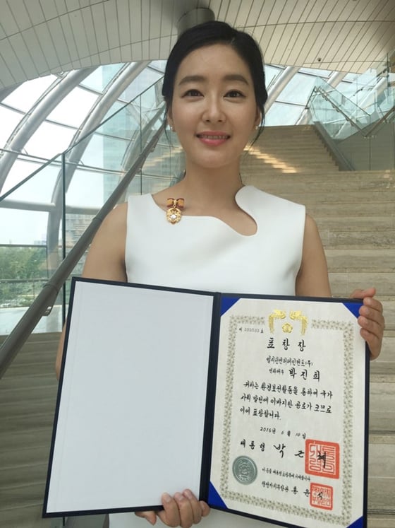 박진희 소속사 엘리펀엔터테인먼트 측에 따르면 박진희가 17일 오전 전경련회관에서 열린 환경 유공자 정부포상 전수식에서 대통령 표창을 수여받았다.
