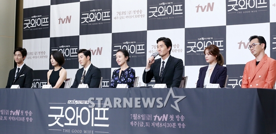 드라마 굿와이프의 출연 배우들과 이정효 감독이 29일 오후 서울 영등포구 타임스퀘어 아모리스홀에서 진행된 tvN 금토드라마 '굿와이프' 제작발표회에 참석해 질의응답을 하고 있다.