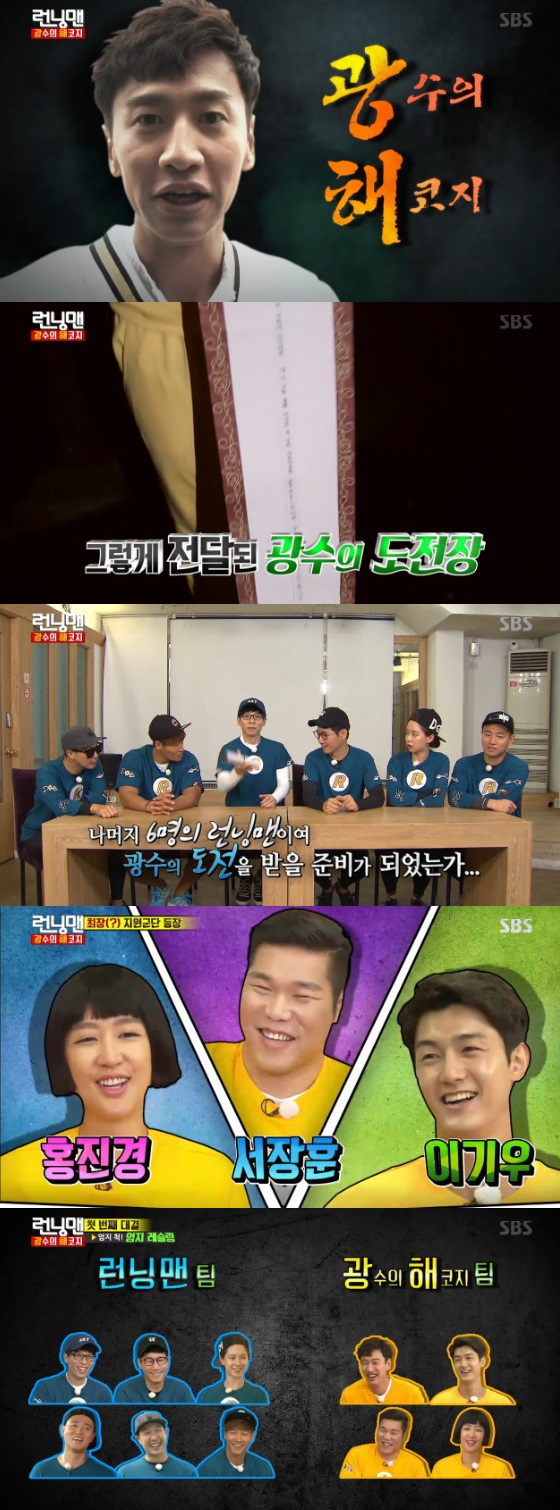 24일 오후 방송된 SBS 예능 프로그램 '일요일이 좋다-런닝맨'(이하 '런닝맨')은 '광수의 해코지-광해 레이스'편으로 전 농구선수 서장훈, 모델 홍진경, 배우 이기우가 이광수의 지원군으로 나서 런닝맨 멤버들과 대결을 펼쳤다.