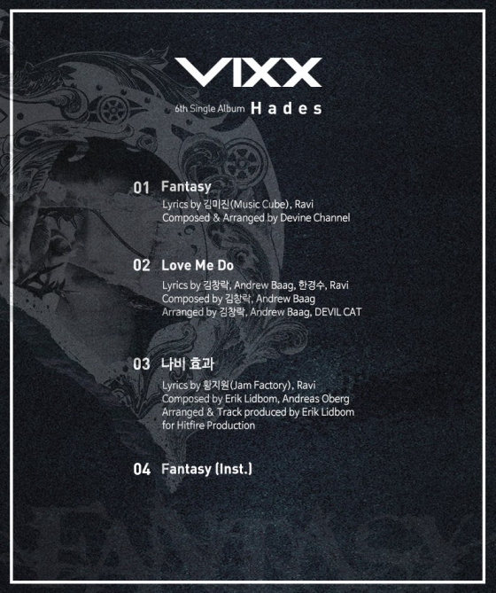 빅스는 5일 정오 공식 소셜 채널을 통해 '빅스 2016 컨셉션(VIXX 2016 CONCEPTION)’ 두 번째 작품이자 여섯 번째 싱글 앨범인 '하데스'(Hades)의 트랙리스트를 공개했다.