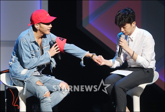 2PM 준케이(JUN.K)가 8일 오후 서울 광진구 광장동 예스24 라이브홀에서 열린 첫 솔로 미니앨범 'Mr. NO♡' 쇼케이스에서 사회를 맡은 우영과 인사를 나누고 있다.