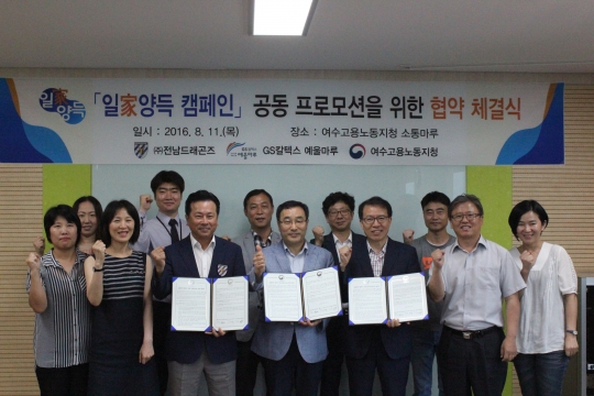 전남드래곤즈와 여수고용노동지청이 11일 여수고용노동지청에서 '일家양득 캠페인 공동 프로모션을 위한 업무협약'을 체결했다.