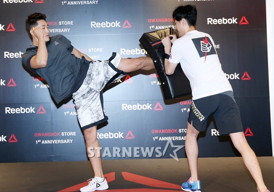 이종격투기 선수 김동현이 27일 오후 부산 중구 리복 광복점에서 진행된 '리복 부산 광복 스토어 오픈 1주년 기념 김동현 팬이벤트'에 참석해 이종격투기 동작 시범을 보이고 있다.