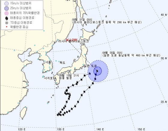 30일 기상청에 따르면 이날 오전 3시 기준 일본 도쿄 동남쪽 460㎞ 부근에서 북상하고 있는 10호 태풍 '라이언록'은 오는 31일 오전 3시쯤에는 러시아 블라디보스토크 동쪽 290km 부근 해상까지 북상할 것으로 보인다.