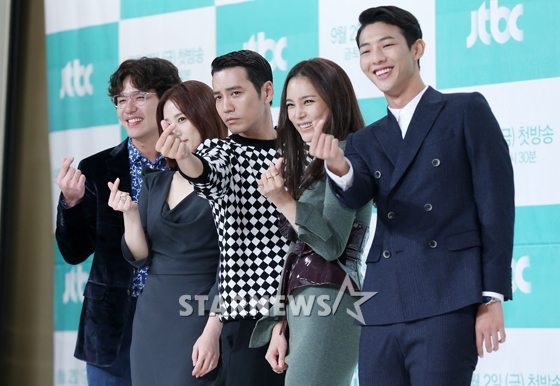 배우 김태훈, 김현주, 주상욱, 박시연, 지수가 30일 오후 서울 영등포구 아모리스 타임스퀘어점에서 진행된 JTBC 드라마 '판타스틱' 제작발표회에 참석해 포즈를 취하고 있다.
