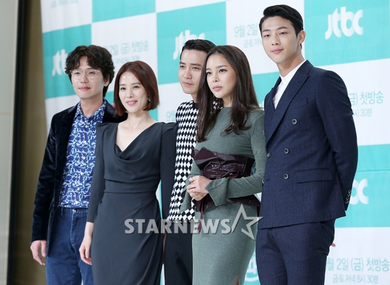배우 김태훈, 김현주, 주상욱, 박시연, 지수가 30일 오후 서울 영등포구 아모리스 타임스퀘어점에서 진행된 JTBC 드라마 '판타스틱' 제작발표회에 참석해 포즈를 취하고 있다.