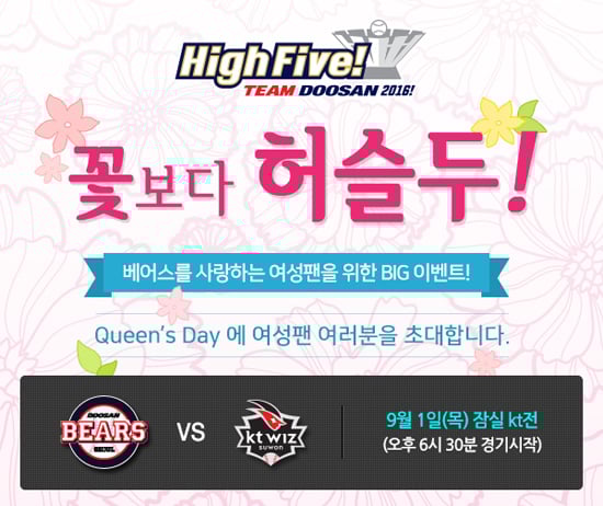 두산 베어스가 9월 1일 잠실 kt전 홈경기를 '퀸스 데이(Queen’s Day)'로 지정하고 여성 팬을 위한 다양한 이벤트를 펼친다.