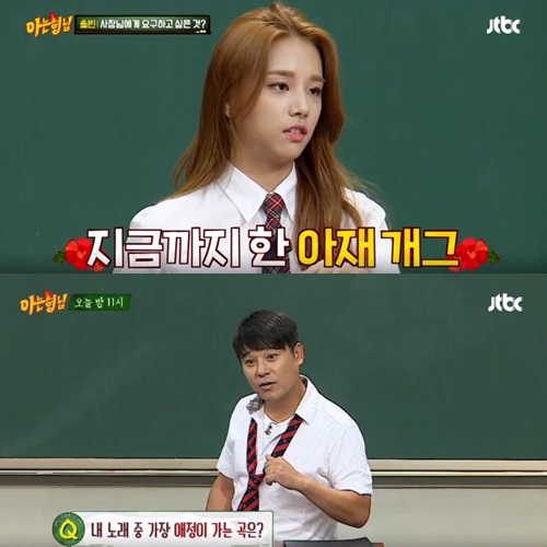 솔빈은 지난 3일 오후 방송된 '아는 형님'에 가수 겸 연기자 임창정과 함께 나서 예쁜 외모와 상반되는 아재 개그를 연이어 선보여 웃음을 줬다. 임창정 역시 특유의 입담과 재치있는 애드리브로 방송 내내 웃음을 선사했다.