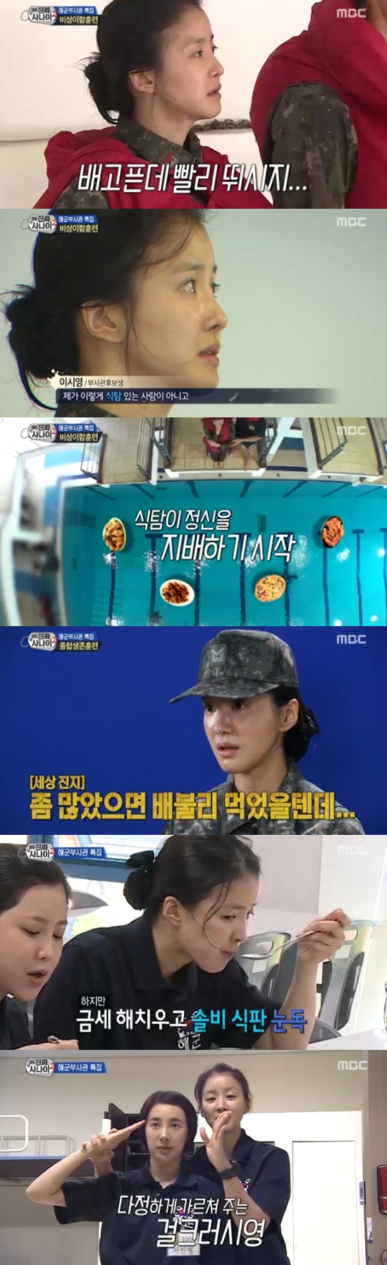 앞서 30초 배식 훈련으로 식사를 제대로 못했던 탓에 이시영은 계속해서 먹을 것에 집착했다. 비상이함훈련에 이어 종합생존훈련이 진행된 가운데 교관은 승리한 조에게 초코과자와 콜라를 제공하겠다고 밝혔다. 모두 초코과자에 욕심냈지만 이시영은 유독 초코과자를 생각하며 열심히 훈련에 임했다. 이시영은 "초코과자가 걸려있었다. 진짜 너무 먹고 싶었다"며 "원래 초코과자는 누가 줘도 많이 먹지 않았다"라고 말했다.