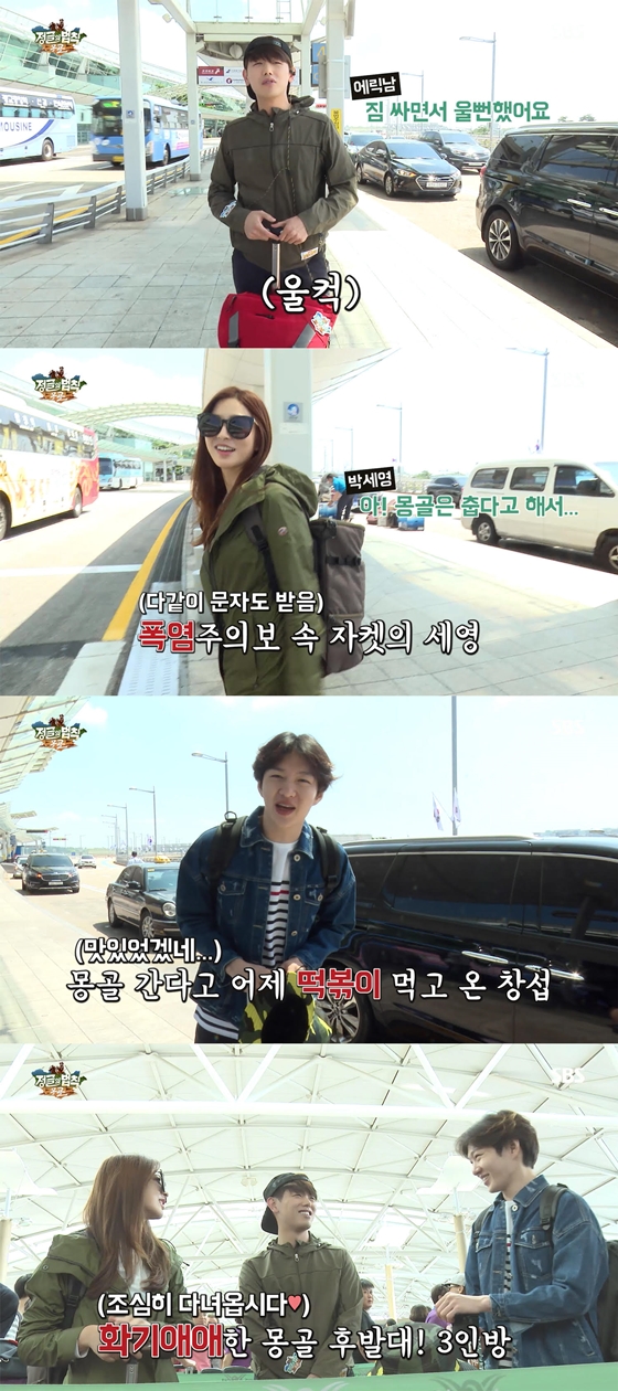 5일 공개된 '정글의 법칙' 몽골 출국 영상에는 불볕더위가 지속됐던 지난 8월 중순 오후 몽골행 비행기 탑승을 준비하는 세 사람의 모습이 담겼다.